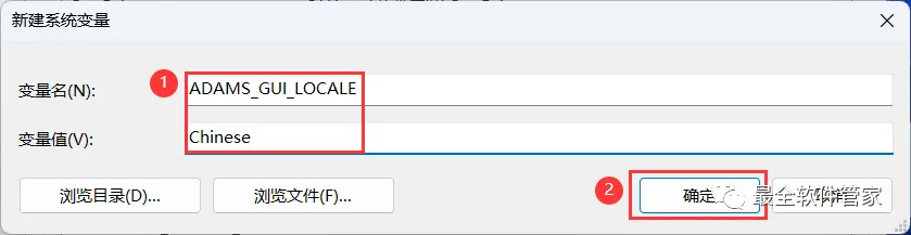 40、变量名输入:ADAMS_GUI_LOCALE;变量值输入:Chinese,再点击【确定】