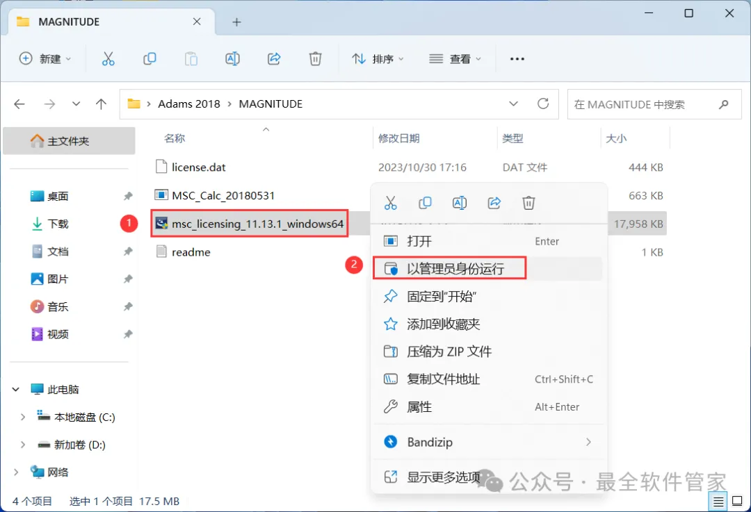 7、找到【msc_license_11.13…】应用程序,右键选择【以管理员身份运行】它