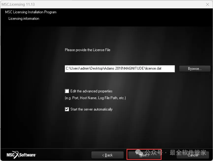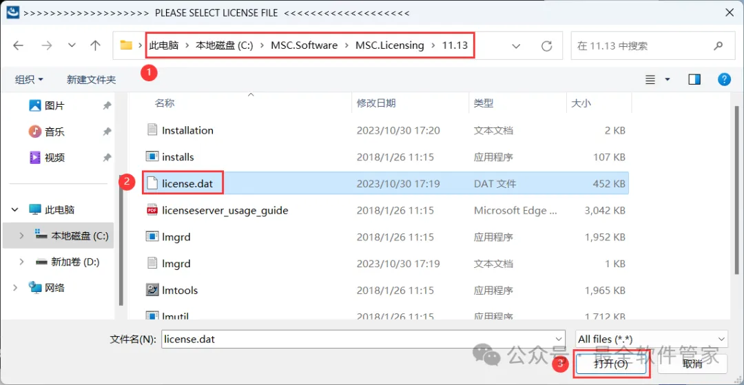27、选择路径为:C:\MSC.Software\MSC.Licensing\11.13,找到并选中【license.dat】文件,再点击【打开】