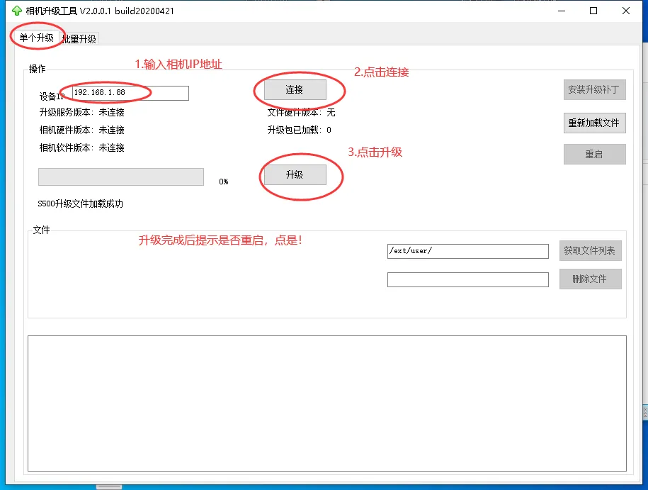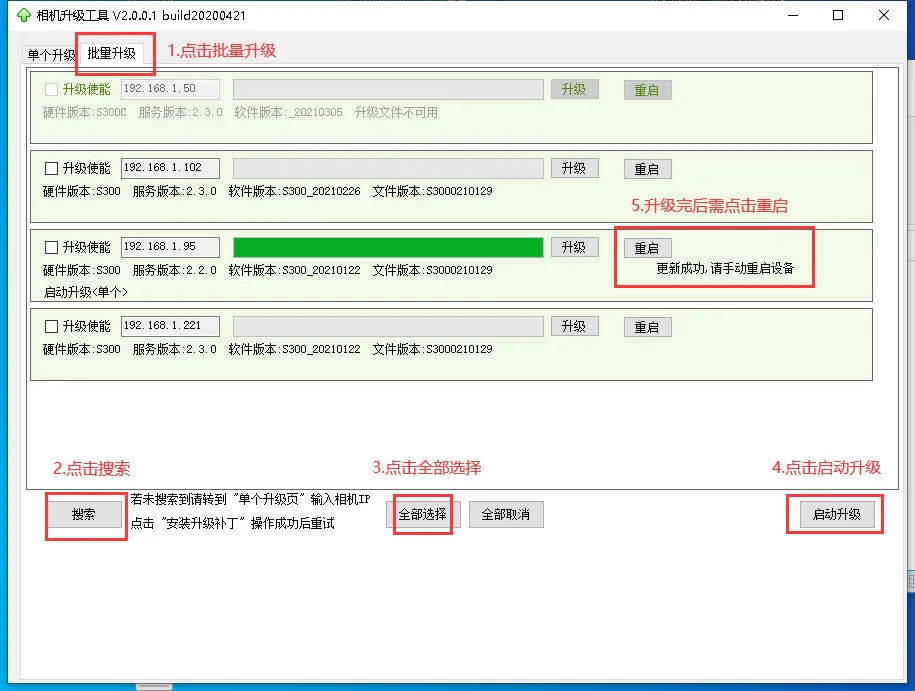 https://cloud.189.cn/web/share?code=Qb6Fjque6Rr2(访问码:n80h)b、单个相机升级:1.输入相机IP地址;2.点击连接;3.连接成功后点击升级;升级完成后会提示是否重启相机,点击是即可;c、批量升级相机:1.点击批量升级;2.点击搜索;3.点击全部选择;4.点击启动升级;5.升级完后每个相机需要点下重启;https://cloud.189.cn/web/share?code=U7VBZbzIRjui(访问码:kr2m)