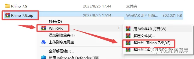 1.选中下载的压缩包,然后鼠标右键选择解压到“Rhino7.9”(没有解压选项点这里)