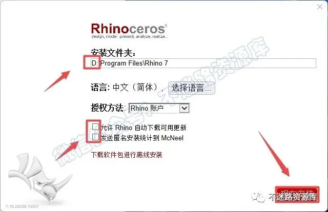 4.选择软件安装路径,建议和教程中的保持一致,本例安装到D盘(将路径地址中的首字符C改为D表示安装到D盘,安装路径不要出现中文),取消勾选“允许Rhino自动下载可用更新”和“发送匿名安装统计...”,然后点击“现在安装”