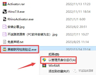 7.返回之前解压的“Rhino7.9”文件夹,鼠标右键点击“屏蔽联网检测验证.exe”选择“以管理员身份运行”