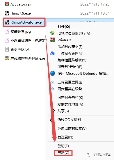 9.返回之前解压的“Rhino7.9”文件夹,找到“RhinoActivator.exe”文件,鼠标右键选择“复制”