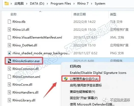 12.找到并选中复制过来的”RhinoActivator.exe“文件,鼠标右键点击“以管理员身份运行”