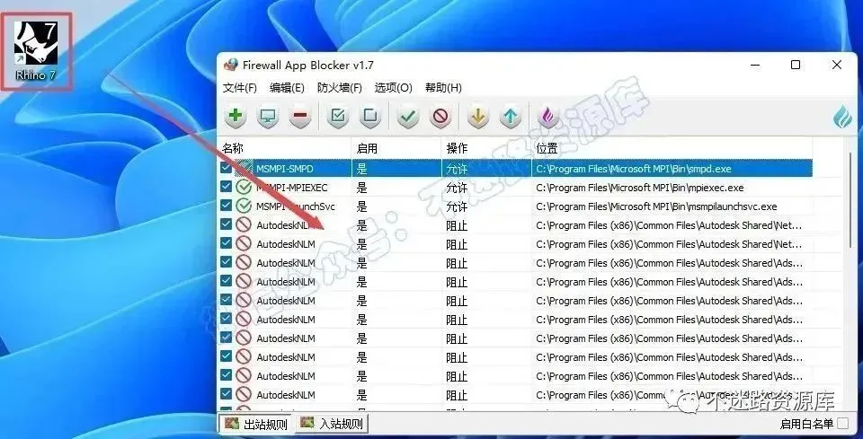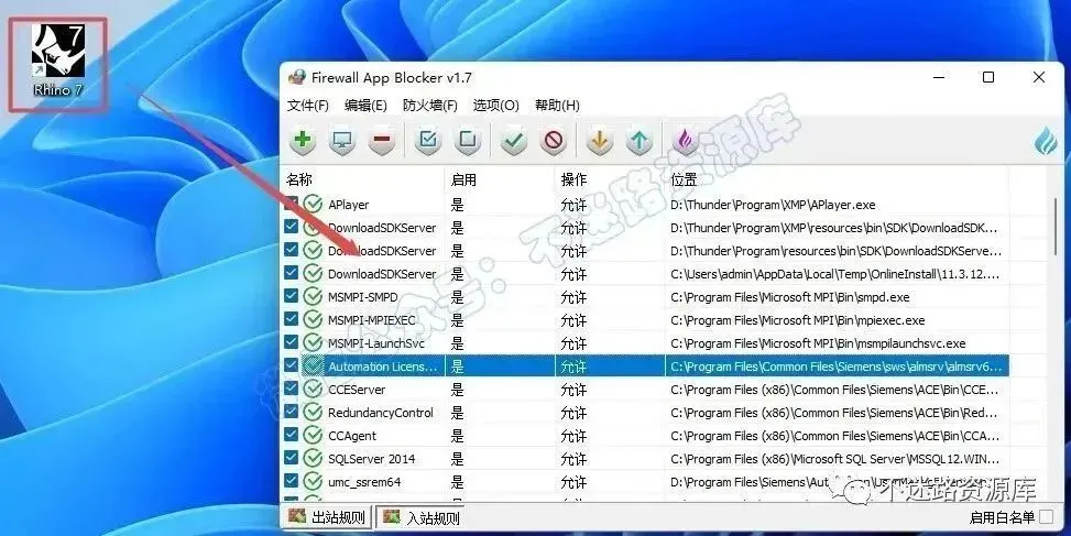 17.点击“入站规则”,将TRhino 7程序直接拖动到程序界面中