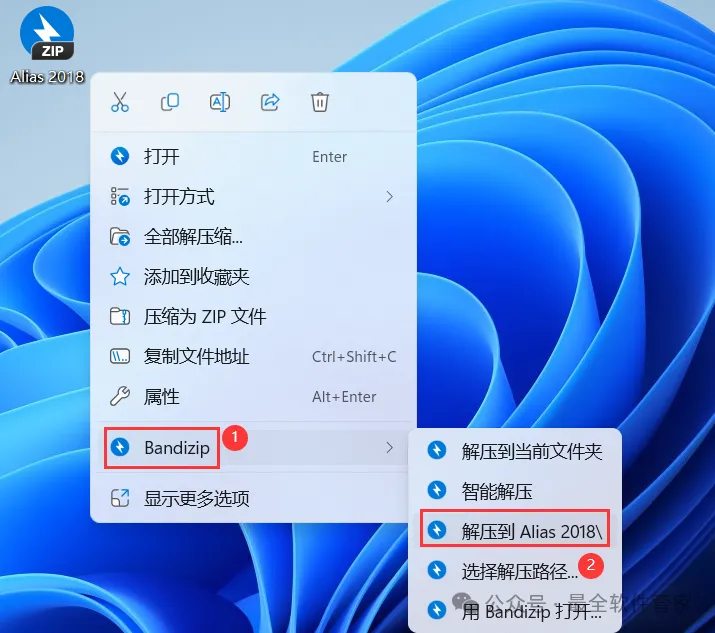 1、下载Alias 2018软件安装包到电脑上,右键选择【解压到Alias 2018\】