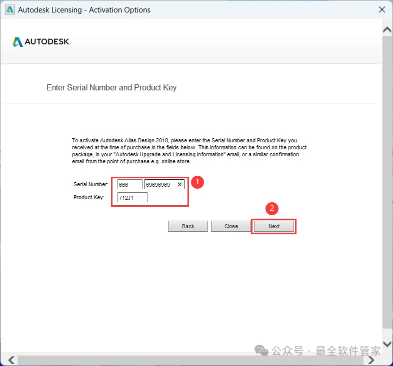 17、Serial Number输入:666-69696969,Product Key输入:712J1,再点击【Next】
