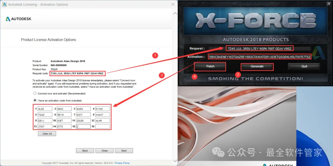 21、打开软件界面,将软件的【Request code】填入到程序的【Requset】内,再点击【Generate】,将程序的【Activation】填入到软件的【I have an…】内,再点击【Patch】