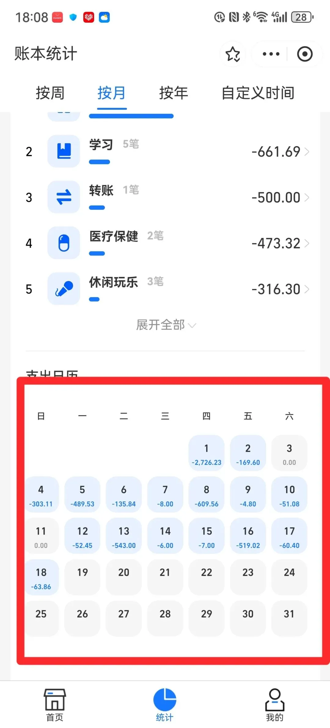 在统计里,也是有非常清晰的图表,能具体到每天的开支是多少