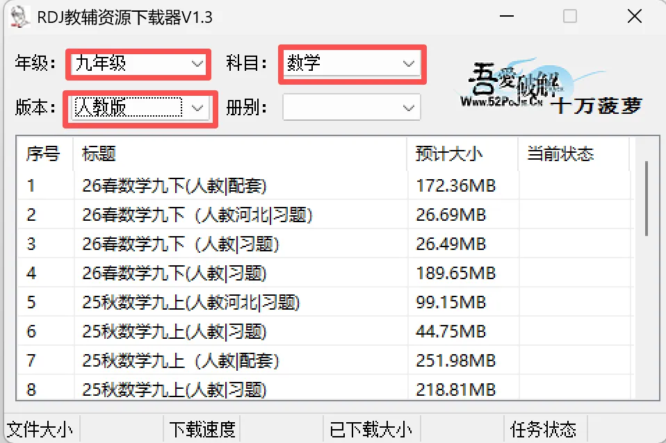 选择年级、科目、版本,自动会刷新列表,显示习题。鼠标对准右键可直接下载。