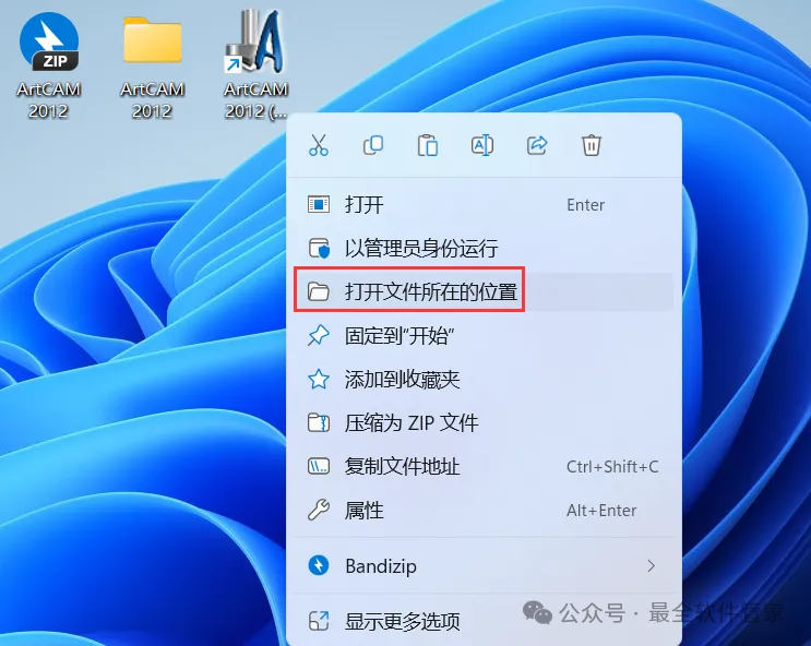 17、回到桌面,右键桌面上的【ArtCAM 2012软件图标】,点击【打开文件所在的位置】