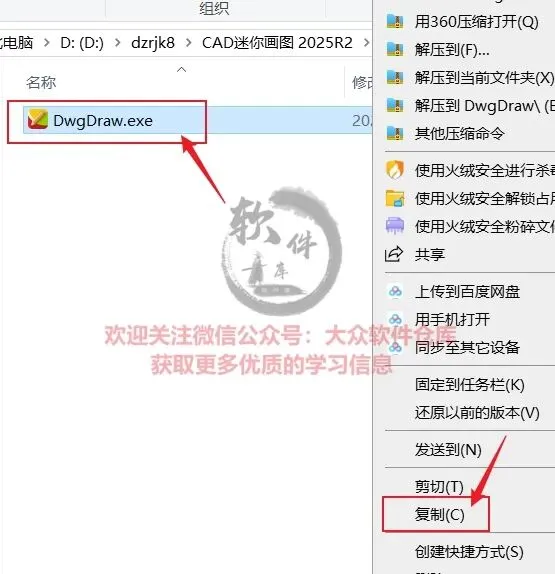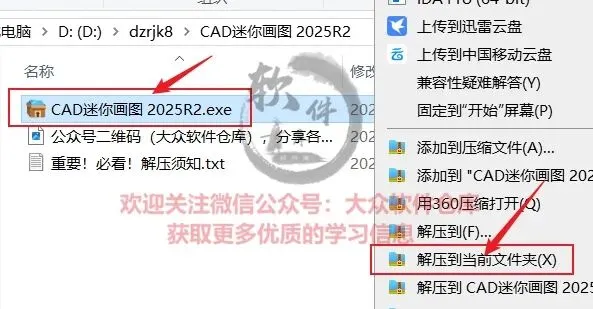 1.把资源从网盘下载到电脑上面,右键CAD迷你画图 2025R2.exe压缩包选择解压到当前文件夹;