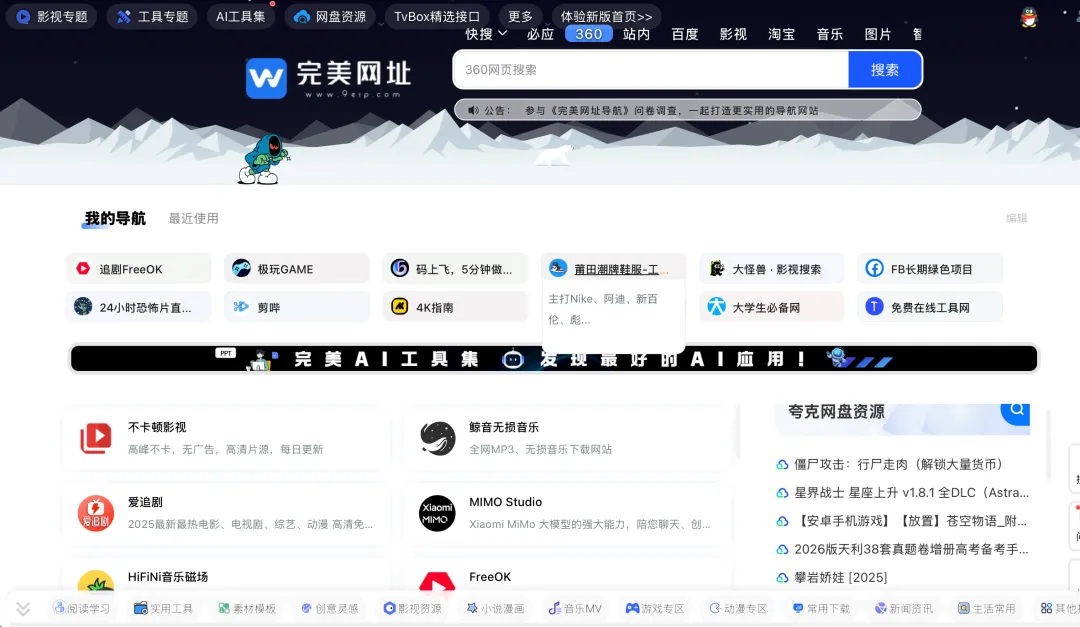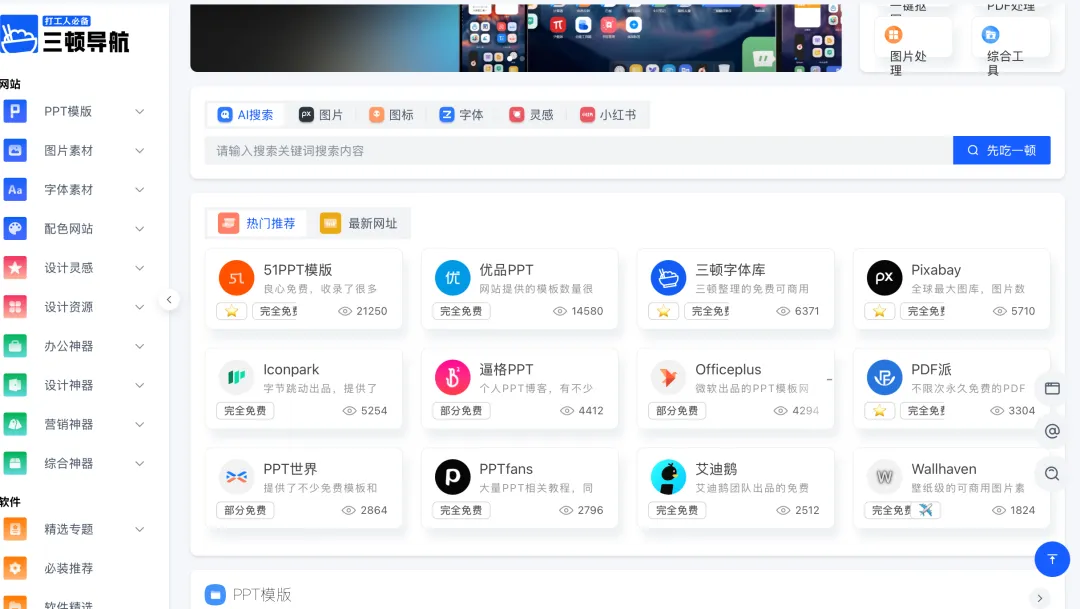 1)软仓:是一个集合大型专业软件的导航网站,提供软件介绍和软件安装教程,包含Adoebe系列软件、AutoCad系列软件、3dsMax、达芬奇软件、CINEMA 4D、matlab软件等。网页地址:https://www.ruancang.net2)MACWK:是一个Mac电脑软件网站,提供专业的软件、插件、图片、视频、教程等,包含图片素材,插件素材,Mac使用教程,mac软件下载综合性资源网。网页地址:https://mac.mac89.com/3)奇迹秀:是一个公益组织,为设计师提供设计干货及资源,站内所有收集的资源都能免费下载,且资源都经过组织成员测试后再发布,保证资源绿色。网页地址:https://www.qijishow.com1)三顿导航:收录了从文档、音视频处理到资源下载、桌面/系统优化等各个类别的实用小工具。设有专题分类,包含必装推荐、PDF处理、PPT插件等多个实用版块。网页地址:https://www.sandunppt.com2)完美网址导航:拥有超强的聚合搜索,精选大量实用的网址,生活、办公、影视、工具、好玩实用的网站。网页地址:https://www.9eip.com/3)I❤️PDF:完全免费、易于使用、丰富的PDF处理工具,包括:合并、拆分、压缩、转换、旋转和解锁PDF文件,以及给PDF文件添加水印的工具等。仅需几秒钟即可完成。网页链接:https://www.ilovepdf.com/4)Docsmall:压缩工具,在线文件处理工具,免费处理图片和PDF。网页链接:https://docsmall.com