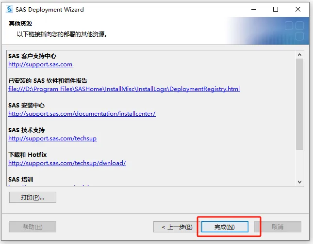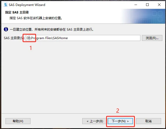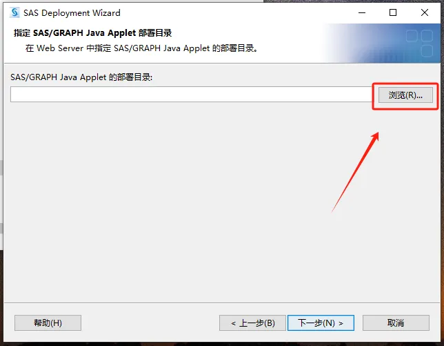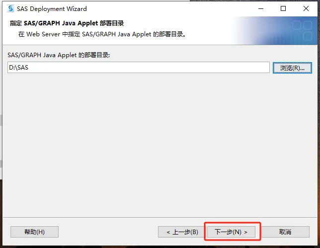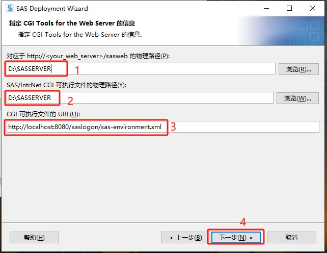 第三十步:点浏览,在D盘建一个名为【SASSERVER】的文件夹,并选择,【URL处填写:http://localhost:8080/saslogon/sas-environment.xml】。然后点【下一步】。