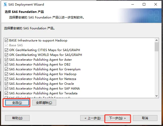 第八步:点【全选】后,取消【SAS Bridge for Esri】的勾选,然后点下一步。