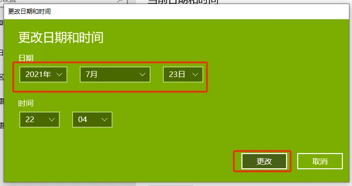 第十九步:将电脑日期调整为2021年7月23日,然后点更改。