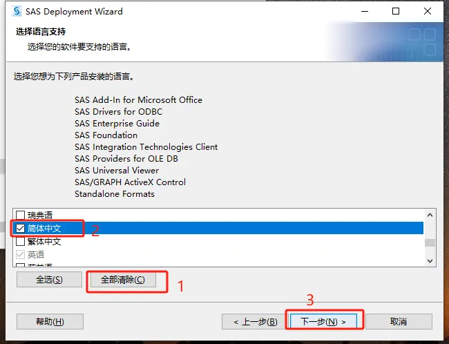 第二十一步:选择【全部清除】,然后只勾选【简体中文】,然后点【下一步】。