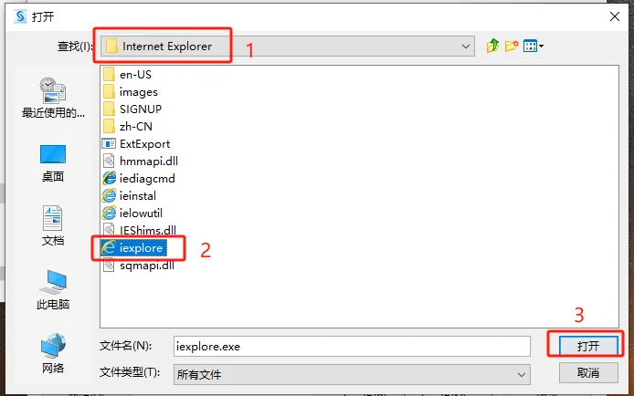 第二十五步:打开路径【C:\Program Files\Internet Explorer】,点击【iexplore】并选中,点击【打开】。