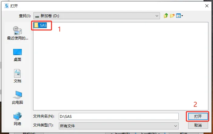 第二十八步:选择软件要安装的磁盘(如:D盘);鼠标右键空白处新建一个【SAS】文件夹并选中;点击【打开】。