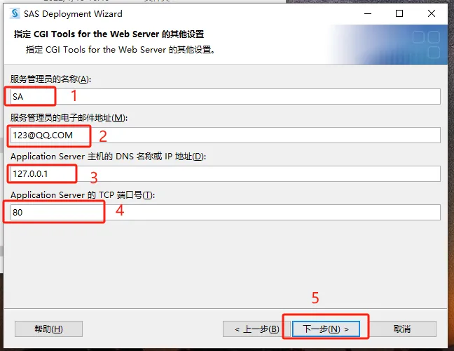 第三十一步:服务管理员和电子邮件随意填写,但是要记住,服务器ip填写【127.0.0.1】,端口写【80】。