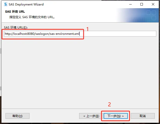 第三十五步:【URL处填写:http://localhost:8080/saslogon/sas-environment.xml】,然后点【下一步】。
