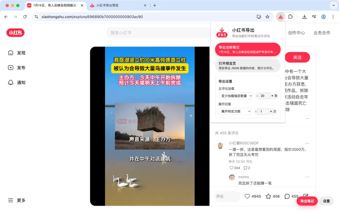 一款支持小红书笔记与评论内容,支持将正文、话题标签、发布时间、作者信息、互动数据、评论与回复等整理为结构化 JSON,并下载备份保存的浏览器扩展插件;可用于个人学习研究、资料归档、内容整理与离线查阅,帮助你在信息变动或内容被删时保留可访问的记录。