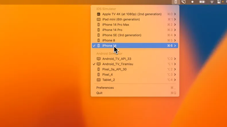 启动模拟器:无需打开 Android Studio 或 Xcode,菜单栏即可直接调用所有模拟器。