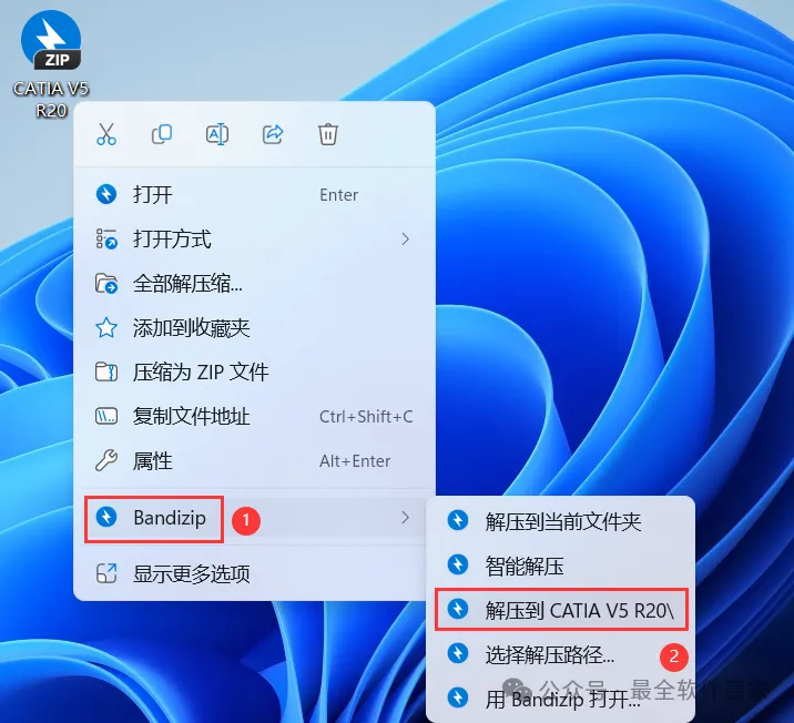 1、下载CATIA V5 R20软件安装包到电脑上,右键选择【解压到CATIA V5 R20\】