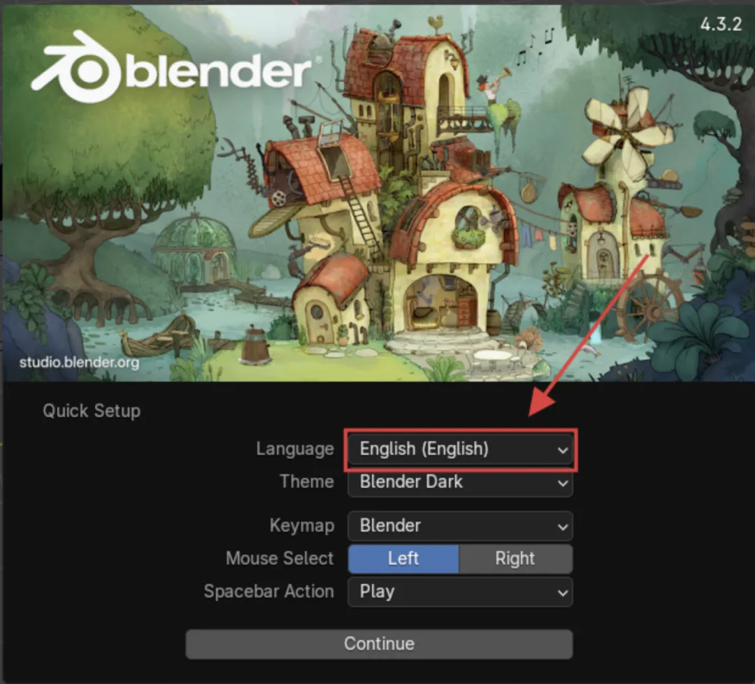 桌面双击Blender图标启动程序,点击语言选择框,选择:简体中文,后点击:继续。