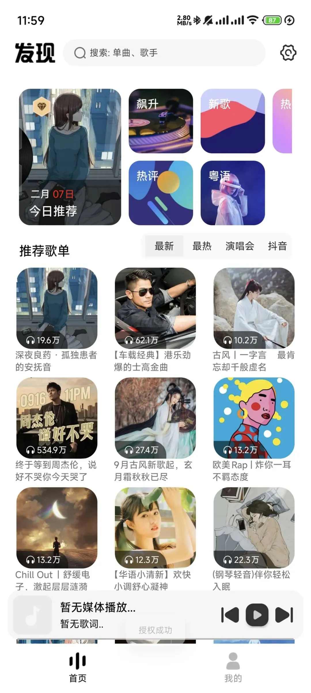 安装好之后,打开软件,你会看到一个非常清爽的首页,里面有很多精选歌单和歌曲推荐。除此之外,在“我的”模块中,它还支持绑定其他主流听歌软件的歌单,随时可以切换,方便极了。如果你有多个平台的歌单,完全不用担心没法管理,统统可以汇聚到这个音乐软件里。