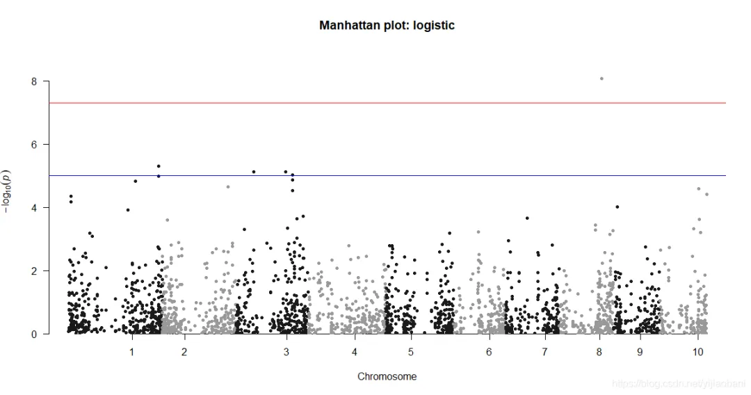 manhattan(d1,chr="Chr",bp="Pos",p="p",snp="Marker", main = "Manhattan plot: logistic")tiff("y1-曼哈顿图.tiff")manhattan(d1,chr="Chr",bp="Pos",p="p",snp="Marker", main = "Manhattan plot: logistic")dev.off()qq(d1$p, main = "Q-Q plot of GWAS p-values : log")tiff("y1-QQ图.tiff")qq(d1$p, main = "Q-Q plot of GWAS p-values : log")dev.off()「曼哈顿图:」