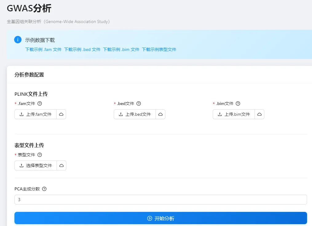 ## 对TASSEL GLM 模型可视化library(qqman)library(data.table)results_log = fread("mlm-result.txt", head=TRUE)dim(results_log)head(results_log)library(tidyverse)select = dplyr::selecttable(results_log$Trait)d1 = results_log %>% filter(Trait == "dpoll") %>% select(Chr,Marker,Pos,p)head(d1)summary(d1)d1 = d1 %>% drop_na(p)summary(d1)manhattan(d1,chr="Chr",bp="Pos",p="p",snp="Marker", main = "Manhattan plot: logistic")tiff("y1-曼哈顿图.tiff")manhattan(d1,chr="Chr",bp="Pos",p="p",snp="Marker", main = "Manhattan plot: logistic")dev.off()qq(d1$p, main = "Q-Q plot of GWAS p-values : log")tiff("y1-QQ图.tiff")qq(d1$p, main = "Q-Q plot of GWAS p-values : log")dev.off()d2 = results_log %>% filter(Trait == "EarDia") %>% select(Chr,Marker,Pos,p)head(d2)summary(d2)d2 = d2 %>% drop_na(p)summary(d2)tiff("y2-曼哈顿图.tiff")manhattan(d2,chr="Chr",bp="Pos",p="p",snp="Marker", main = "Manhattan plot: logistic")dev.off()tiff("y2-QQ图.tiff")qq(d2$p, main = "Q-Q plot of GWAS p-values : log")dev.off()d3 = results_log %>% filter(Trait == "EarHT") %>% select(Chr,Marker,Pos,p)head(d3)summary(d3)d3 = d3 %>% drop_na(p)summary(d3)tiff("y3-曼哈顿图.tiff")manhattan(d3,chr="Chr",bp="Pos",p="p",snp="Marker", main = "Manhattan plot: logistic")dev.off()tiff("y3-QQ图.tiff")qq(d3$p, main = "Q-Q plot of GWAS p-values : log")dev.off()fwrite(d1,"y1_result.csv")fwrite(d2,"y2_result.csv")fwrite(d3,"y3_result.csv")另外,之前推荐的平台,发现也上线了GWAS模块,但是有点单一,简单是很简单: