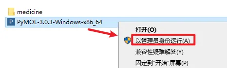 2.打开解压好的文件夹,找到并选中“PyMOL-3.0.3..”右键选择“以管理员身份运行”