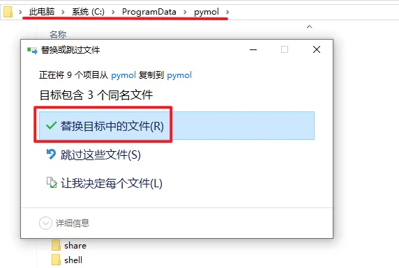 11.粘贴复制的文件夹到C盘下的隐藏文件夹ProgramData-pymol文件夹中,选择“替换目标中的文件”