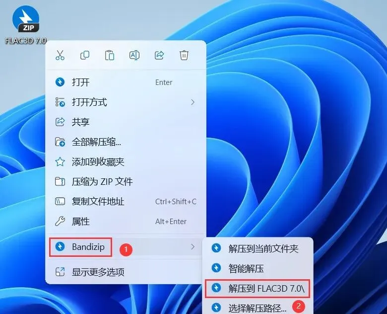 1、下载FLAC3D 7.0软件安装包到电脑上,右键选择【解压到FLAC3D 7.0\】