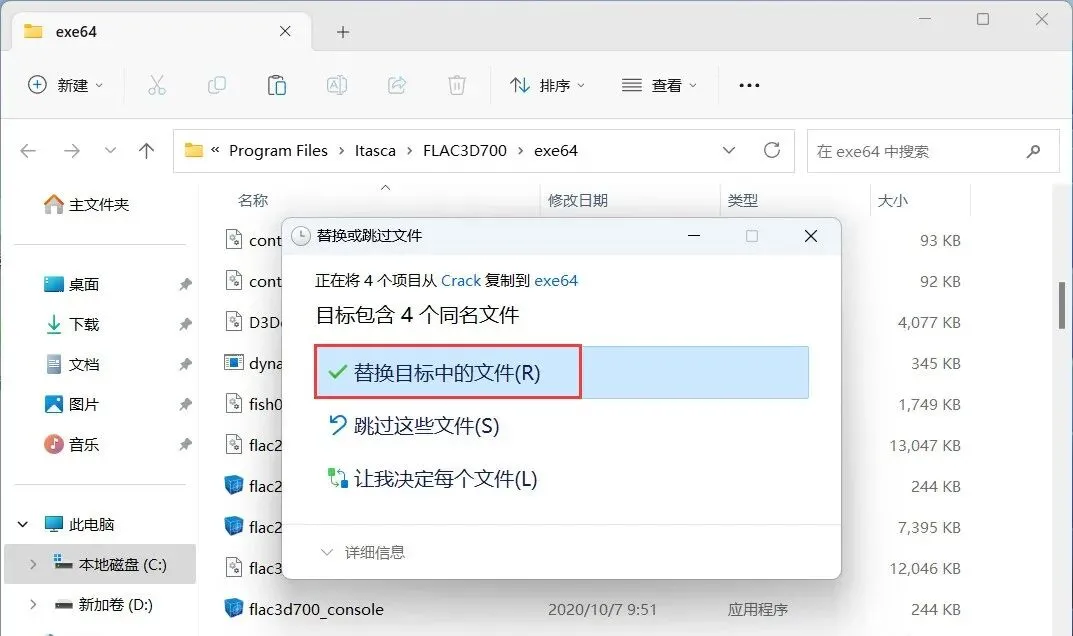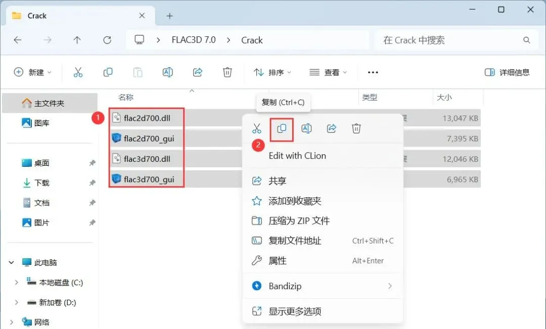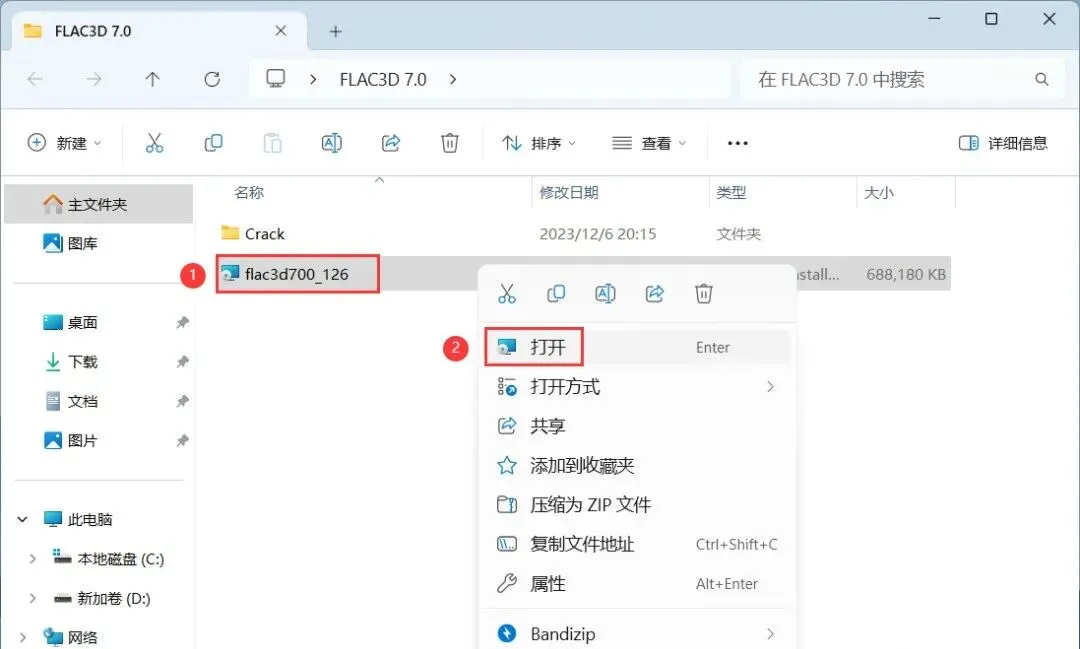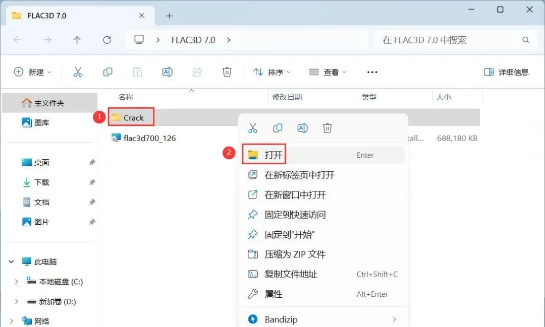 11、回到FLAC3D 7.0文件夹,找到【Crack】文件夹,右键【打开】它