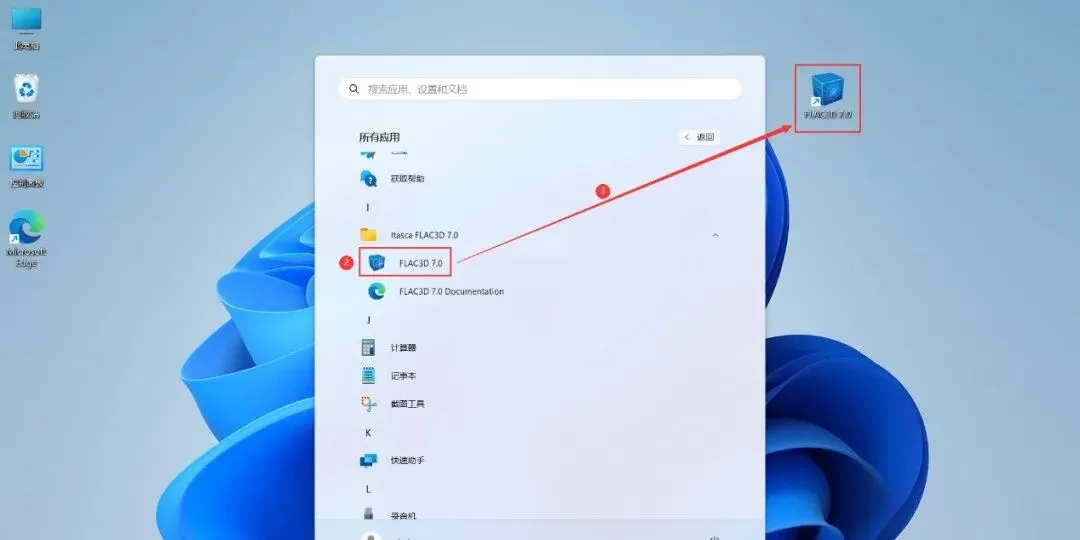 13、回到桌面,点击任务栏的【开始菜单】,在【所有应用】中找到【FLAC3D 7.0软件图标】,将软件图标拖到桌面上,完成软件桌面快捷方式的创建