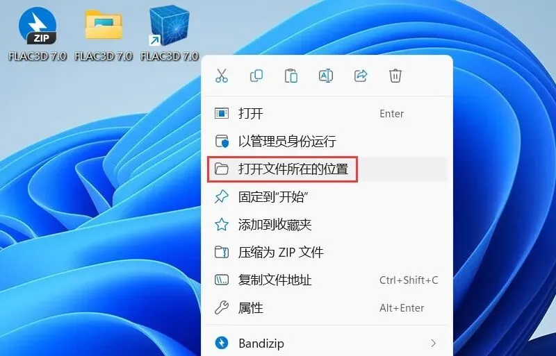14、右键桌面上的【FLAC3D 7.0软件图标】,点击【打开文件所在的位置】