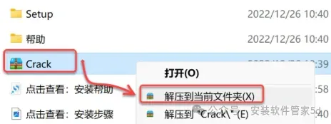 鼠标右击 Crack,选择 解压到当前文件夹。如果安装包里没有 Crack 文件,关闭杀毒软件后重新解压安装包。