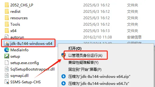 第三步:(配置java环境变量)选中【jdk-8u144-windows-x64】,右击以管理员身份运行。
