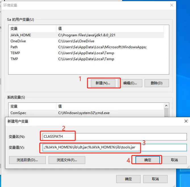 第十三步:在“用户变量”中点击【新建】,输入变量名【CLASSPATH】,输入变量值【.;%JAVA_HOME%\lib\dt.jar;%JAVA_HOME%\lib\tools.jar】 ,点击【确定】。