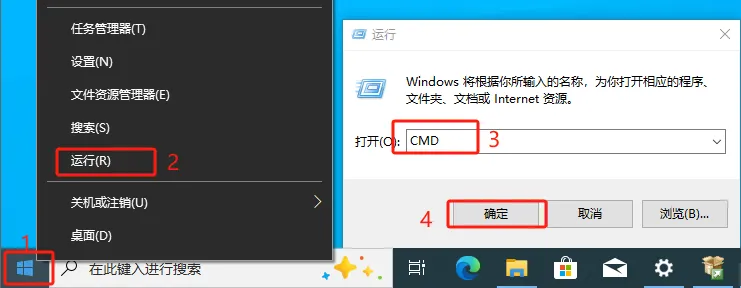 第十六步:鼠标右键电脑桌面【开始】菜单,选择【运行】,输入【cmd】,点击【确定】。