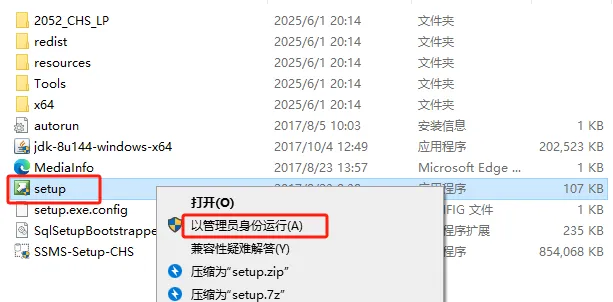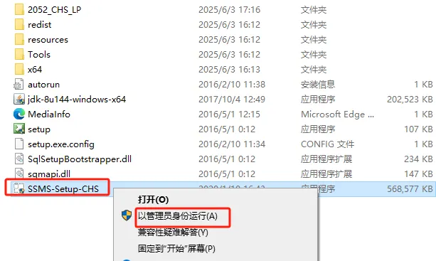 第四十一步:返回解压后的文件夹,找到【SSMS-Setup-CHS】,右击【以管理员身份运行】(注:英文极好的大侠,可以忽略此步)