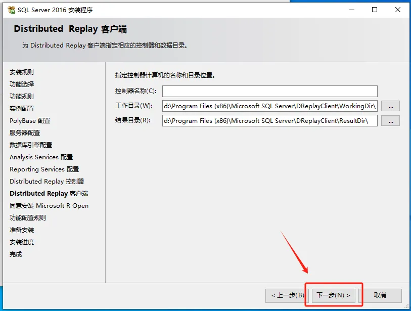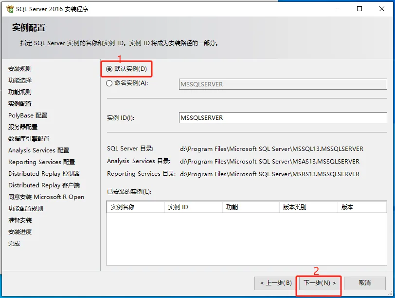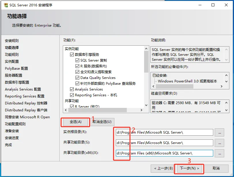 第二十六步:1、点【全选】,如熟悉数据库,可自定义勾选;2、将安装位置改为D盘;3、点【下一步】。