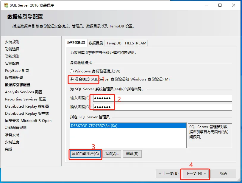 第三十步:1、选择混合模式;2、输入一个数字字母组合的密码;3、点【添加当前用户】;4、点【下一步】。