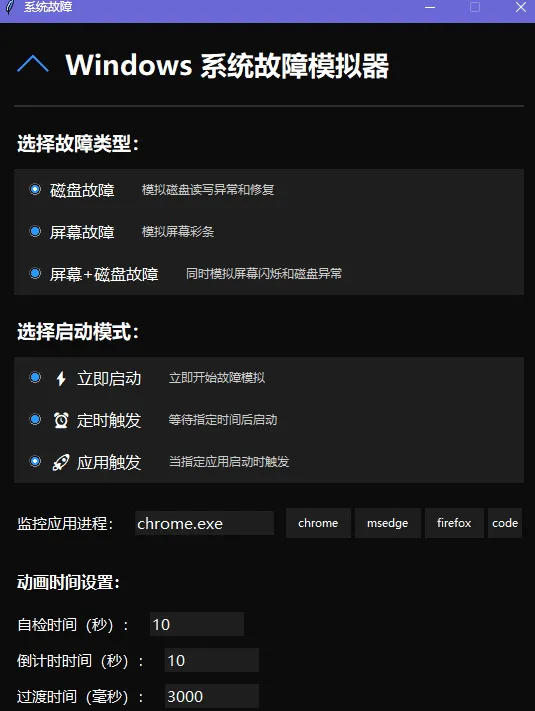 应用触发: 支持监控指定软件(如 Chrome、Edge、VS Code 等),当对方试图打开浏览器或特定程序时,屏幕瞬间“崩溃”——想象一下,朋友刚想偷偷上网,电脑立马“坏”给他看,这波心理博弈简直在大气层!