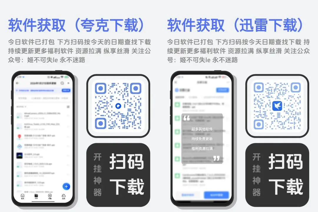除上方安卓软件以外,今天还额外更新了几十款其他的安卓软件,包含各种功能各种领域,需要的伙伴可以扫码查看⬆️iOS用户每日也有特殊软件资源,就是少一些,扫码也可查看下载每日资源⬆️
