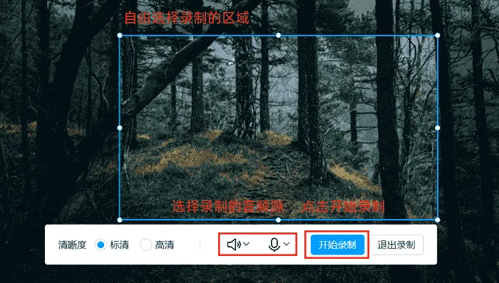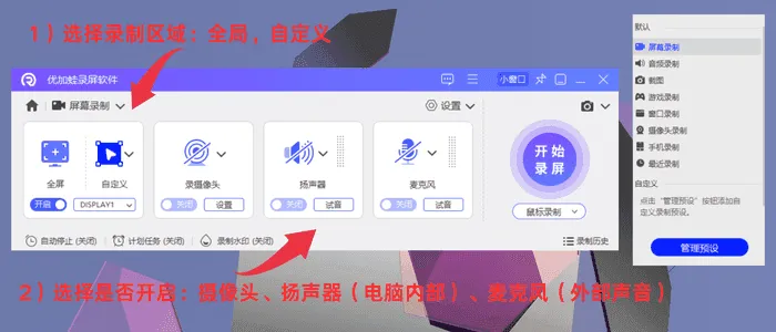 2. 进入视频录制操作界面,录制范围及音频输入的调整功能都能找到,按照自身需求调整好参数后,点击【开始录制】按钮即可启动;