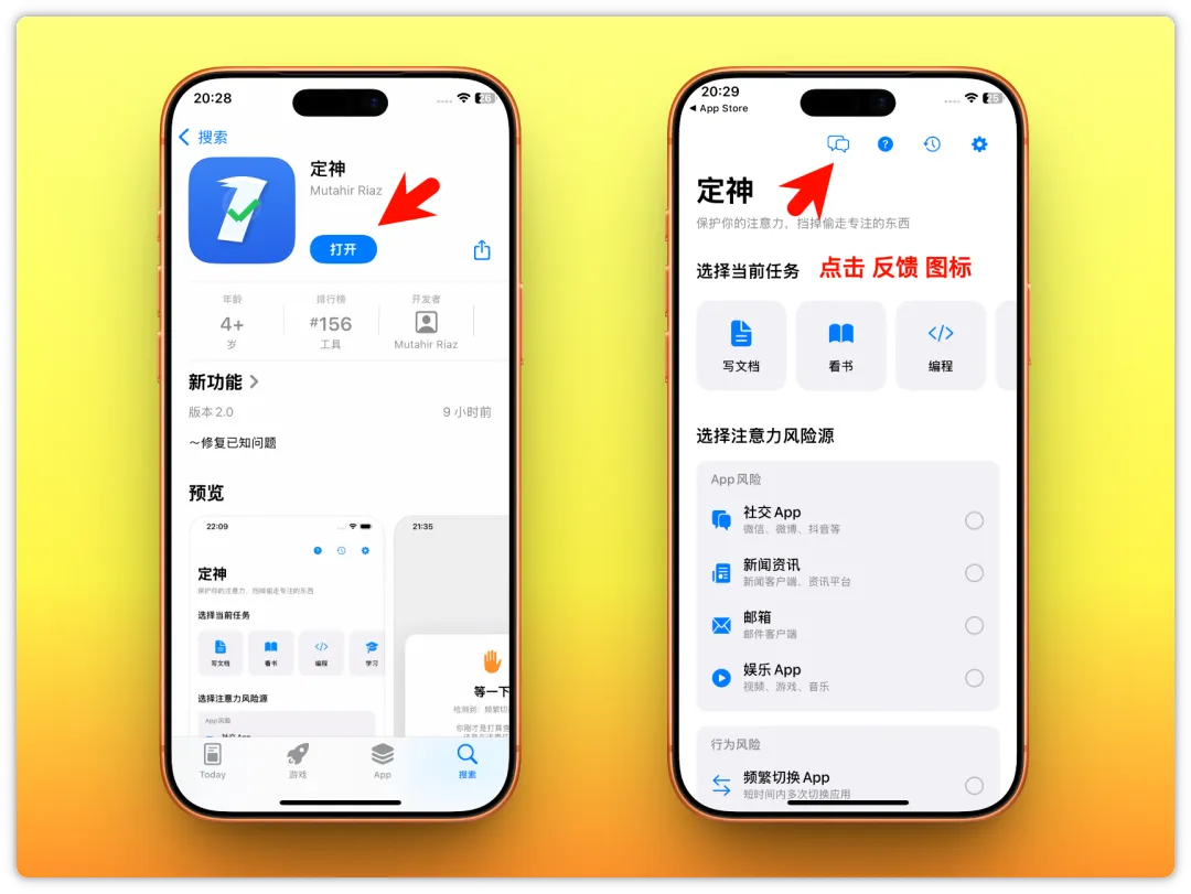打开APP,点击左上角的反馈图标